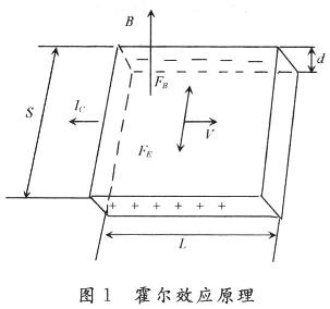 如圖1所示,一個(gè)N型半導(dǎo)體薄片,長(zhǎng)度為L(zhǎng),寬度為S,厚度為d,在垂直于該半導(dǎo)體薄片平面的方向上,施加磁感應(yīng)強(qiáng)度為B的磁場(chǎng),若在長(zhǎng)度方向通以電流Ic則運(yùn)動(dòng)電荷受到洛倫茲力的作用,正負(fù)電荷將分別沿垂直于磁場(chǎng)和電流的方向向?qū)w兩端移動(dòng),并聚集在導(dǎo)體兩端形成一個(gè)穩(wěn)定的電動(dòng)勢(shì)UH,這就是霍爾電動(dòng)勢(shì)(或稱(chēng)之為霍爾電壓),這種現(xiàn)象稱(chēng)為霍爾效應(yīng)?;魻栯妷旱拇笮H=RIB/d=KHICB,其中R為霍爾常數(shù);KH為霍爾元件的乘積靈敏度。