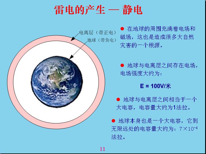 為什么會(huì)產(chǎn)生雷電?可能大部分人都不知道,我在這里就給大家講解一下雷電是怎么產(chǎn)生的。雷電是由于電磁場產(chǎn)生的,世界上什么電都是通過電磁場反應(yīng)產(chǎn)生的。為什么會(huì)產(chǎn)生雷電呢?因?yàn)樵陔x地球30公里外有一個(gè)電離層,電離層實(shí)際上就是最外的空氣受到太陽光、紫外線照射而產(chǎn)生電離,太陽光實(shí)際上也是一種電磁波,電磁波的作用相當(dāng)于我們把一個(gè)食物放在微波爐里面加熱,原理是差不多的,但是微波的波長線很長,紫外線相當(dāng)短,所以作用不一樣,用微波爐不能把空氣進(jìn)行電離,只有紫外線能夠電離。被電離以后會(huì)分成兩層,一層帶正電,一層帶負(fù)電,與地球相對的一層帶正電,地球就是帶負(fù)電。地球是一個(gè)圓的,帶電的話相當(dāng)于電層強(qiáng)度是散發(fā)性的,越靠近地球電容強(qiáng)度越高,靠近地球表面是100v,也就是說一米高的位置電容強(qiáng)度是100v電容強(qiáng)度就是用這個(gè)來表示,大家在中學(xué)里面很少用電位梯度的概念表達(dá)電容強(qiáng)度,后面我們在工作中還是用電位梯度來表示電容強(qiáng)度是最合適的,比如靈敏度、多少毫伏米都是屬于電感強(qiáng)度。以前是用牛頓的力學(xué)來表達(dá),那個(gè)概念相對來說比較難理解,兩個(gè)帶電物體之間產(chǎn)生多少牛頓力的時(shí)候,換算成單位來表示電容強(qiáng)度,這個(gè)強(qiáng)度不太好理解,如果用電位梯度表示就很方便了。