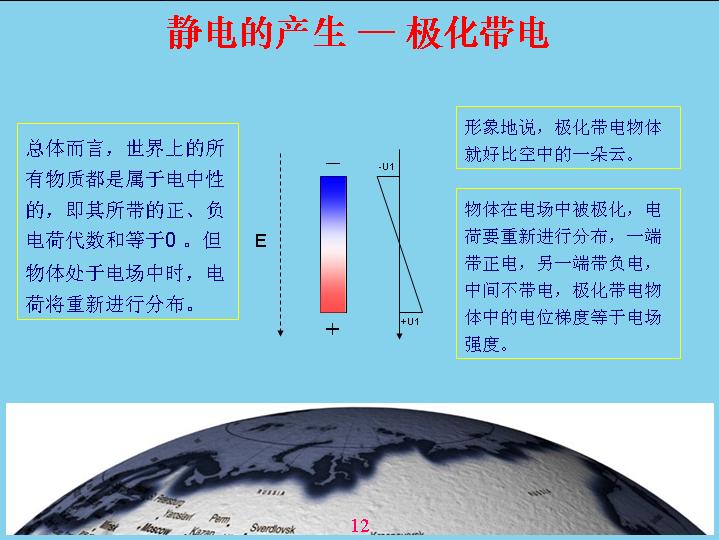 由于地球是帶電的,相對電容層來說。一個(gè)物體在地球空間里面就會(huì)受到電場的作用產(chǎn)生極化,什么叫極化?就是說一個(gè)物體原來是不帶電的,現(xiàn)在產(chǎn)生極化帶電,一端帶正電,一端帶負(fù)電。比如說這個(gè)源相當(dāng)于一個(gè)導(dǎo)體,如果底下是絕緣的話,上面如果沒有屏蔽,我的上面就帶負(fù)電,下面帶正電,中間這個(gè)地方是不帶電的,人相對來說還是偏中性,但是雖然極化帶電的,但我總得來說還是變中性,帶的正電和負(fù)電都是相等的。如果把原來極化帶電的物體分成兩個(gè),這兩個(gè)都會(huì)帶電。形象地說,一朵云在電場作用下極化帶電,但沒有產(chǎn)品電流,電感強(qiáng)度沒有達(dá)到這么高,如果把它分成兩塊就會(huì)產(chǎn)生電容帶電?,F(xiàn)在由于風(fēng)的作用,把它一吹變成兩塊,中間的地方分成兩塊,有一塊相當(dāng)于帶負(fù)電,有一塊帶正電。這就表示電位曲線,中間這個(gè)地方表示電位反映,上面帶負(fù)電,下面帶正電,這個(gè)幅度越高表示帶電幅度也越高。這個(gè)沒有帶正電,那個(gè)沒有帶負(fù)電,電容性就破壞了,相對來說是帶負(fù)電,這個(gè)帶正電的。云帶電就是因?yàn)檫@樣產(chǎn)生的。