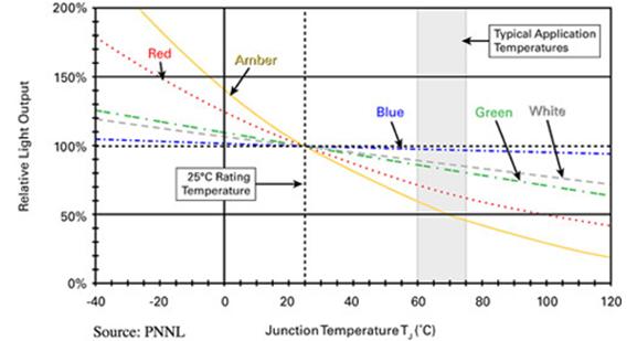 2. 輸出亮度降低:每攝氏度溫度變化導(dǎo)致1%輸出亮度的變化,其中紅燈受影響最顯著。