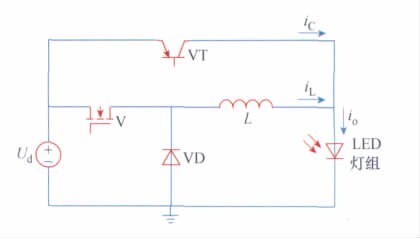 電路如圖1 所示。電路結(jié)構(gòu)以BUCK電路為主,取消電解電容濾波,用輔助線(xiàn)性電路對(duì)電感紋波電流進(jìn)行補(bǔ)償。圖中由開(kāi)關(guān)管V、電感L、LED 燈組、續(xù)流二極管VD 組成主電路; 晶體管VT 為輔助補(bǔ)償電路。