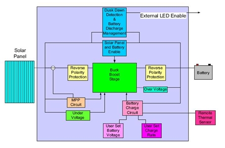 設計工作包括根據(jù)功率需求的增加隔離拓撲結(jié)構(gòu)。電池充電狀態(tài)的管理是由適當?shù)某潆娝惴ㄍ瓿傻?。太陽能電池板安裝技師可以選擇輸出電壓和電池充電速率。由于控制器要連接到太陽能電池板,它必須具有最大功率點跟蹤,為最終客戶提供高價值??刂破饔袃蓚€正使能(Enable)電路,一個電路檢測黑夜時間,另一個檢測電池的充電狀態(tài),使外部電路不會使電池對損壞點放電。由于控制器將由不同程度經(jīng)驗的現(xiàn)場技術(shù)人員和新手安裝,因此重要的是輸入和輸出必須有反向極性保護。另外,控制器和電池可能安裝在過熱或過冷的位置,控制器必須采用電池充電溫度補償。設計還應包括安全功能,如電池過壓檢測和太陽能電池板欠壓檢測。