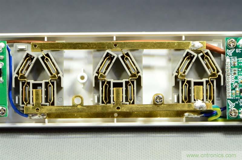 三個插座模塊,使用了高質(zhì)量插排慣例的一體銅條設(shè)計(jì)。