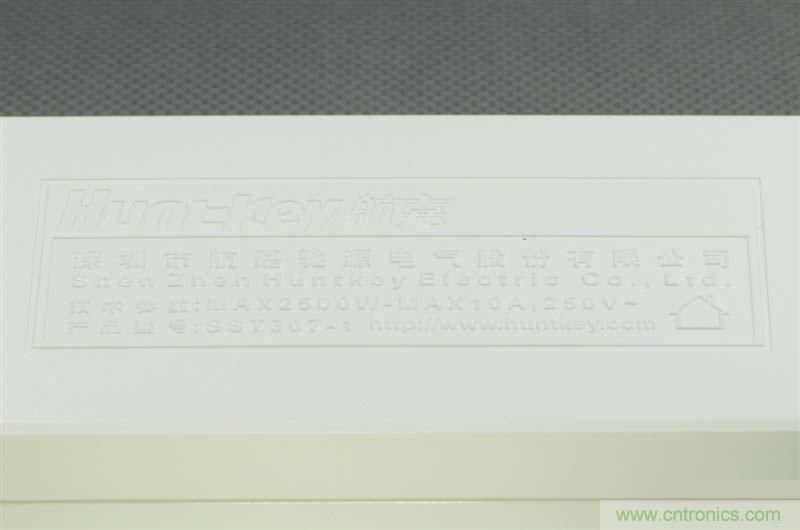 背面技術(shù)參數(shù),型號SST307-01。標(biāo)注了最大10A的工作電流,使用時(shí)候注意連接的用電器不要超過2200W。