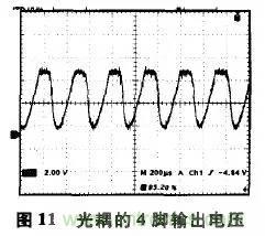 同樣,對于上面的半橋輔助電源電路,用接法2代替接法1,閉環(huán)不穩(wěn)定,用示波器觀察光耦4腳電壓波形,有明顯的振蕩。光耦的4腳輸出電壓(對應(yīng)于UC3525的誤差放大器輸出腳電壓),波形如圖11所示,可發(fā)現(xiàn)明顯的振蕩。這是由于這個半橋電源穩(wěn)態(tài)占空比比較大,按接法2則光耦增益大,系統(tǒng)不穩(wěn)定而出現(xiàn)振蕩。