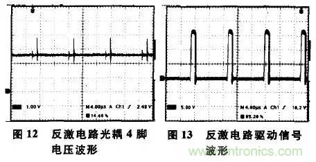 以下是另外一個實(shí)驗(yàn)反激電路,工作在斷續(xù)模式,實(shí)際測得其光耦4腳電壓波形,如圖12所示。實(shí)際測得的驅(qū)動信號波形,如圖13所示,占空比約為0.2。