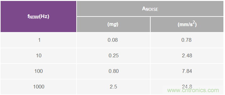 此過程的第一步是利用等式9估計四個不同噪聲帶寬(fNBW)產(chǎn)生的噪聲(ANOISE):1 Hz、10 Hz、100 Hz和1000 Hz。表2用兩個不同單位的線速度給出了這些結(jié)果:g和mm/s2。g在多數(shù)MEMS加速度計規(guī)格表中相當(dāng)常見,但振動指標(biāo)常常不是以此來提供。幸運的是,g和mm/s2的關(guān)系已為大家熟知,參見等式13。
