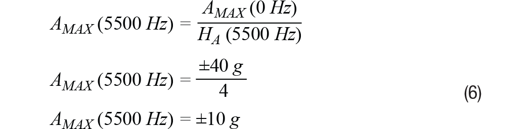 注意,測量范圍與頻率有一定的關(guān)系,因為傳感器的機械響應(yīng)會引入某種響應(yīng)增益,增益響應(yīng)的峰值出現(xiàn)在諧振頻率時。對于ADXL356的仿真響應(yīng)(參見圖3),增益峰值約為4倍,故測量范圍從±40 g降至±10 g。等式6提供了一種分析方法來預(yù)測此值,它以等式5為出發(fā)點: