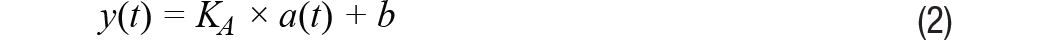 圖2提供了一個簡單的一階模型,其描述了時域中MEMS加速度計對線性加速度(a)的響應(yīng)(y)。在該關(guān)系中,偏置(b)表示傳感器無振動時的輸出值。比例因子(KA)表示MEMS加速度計響應(yīng)(y)相對于線性加速度(a)變化的改變量。