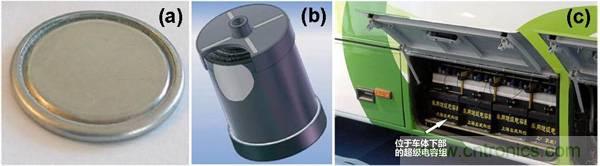 圖1 商業(yè)超級(jí)電容器實(shí)物圖(a, b),混合動(dòng)力汽車中的超級(jí)電容器電源(c)