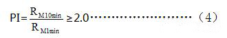 極化指數(shù)(Pl)是測量絕緣電阻時,試驗電壓施加10min時的測量值RM10min與施如1min時的測量值RM10min之比,符合式(4)為合格。