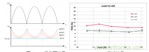 圖5右所示為實測的THD曲線。從曲線可以看出,全電壓輸入狀態(tài)下,在30%負載到100%負載范圍內(nèi),THD都能夠做到低于12%,同時也能夠滿足EN61000-3-2標準要求。