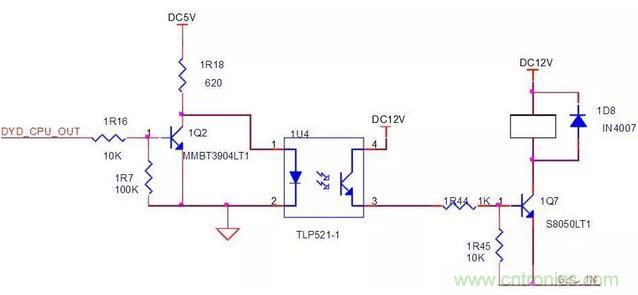 “DYD_CPU_OUT”為高電平,1U4導通,U43=1V,U3=11V,UCE=0V,1Q1-3=0V,線圈兩端電壓為11.7V。 此圖是高電平使能。繼電器的常閉觸點接負載。