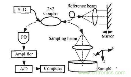 掃描反射鏡并記錄其空間位置,使參考光與來自介質內不同深度的后向散射光發(fā)生干涉。根據反射鏡位置和相應的干涉信號強度即町獲得樣品不同深度(z方向)的測量數據.再結合采樣光束在x-y平面內的掃描,所得結果經計算機處理,可獲得樣品的三維結構信息。