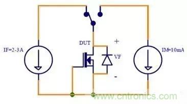 將裝在標(biāo)準(zhǔn)PCB上的器件放在靜態(tài)的空氣中,器件上安裝熱電偶,器件通過一定的功率加熱器件時(shí),當(dāng)連接到管腳的熱電偶達(dá)到穩(wěn)定狀態(tài),測(cè)量環(huán)境空氣的溫度TA和器件封裝管腳的溫度TC或TL,同時(shí)立刻切斷加熱功率,在10us以內(nèi)器件沒有冷卻時(shí),二極管電流切改為10mA,迅速測(cè)量二管極的壓降VF,如圖4所示。測(cè)量二極管的壓降時(shí),使用KELVIN連接法。