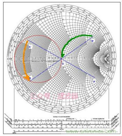 下一步,在圓圖上定位兩個(gè)點(diǎn),zS標(biāo)記為A,zL*標(biāo)記為D。因?yàn)榕c信號(hào)源連接的是第一個(gè)元件是并聯(lián)電感,將源阻抗轉(zhuǎn)換成導(dǎo)納,得到點(diǎn)A’。