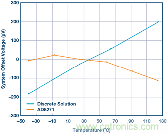 圖5. 系統(tǒng)失調(diào)與溫度的關(guān)系——AD8271與分立解決方案比較