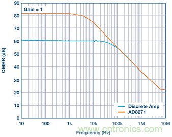 圖3. CMRR與頻率的關(guān)系——AD8271與分立解決方案CMRR比較
