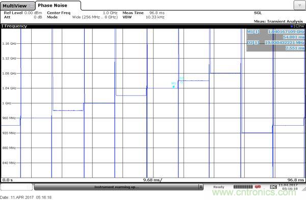 基于目前的相位噪聲分析儀可以進行瞬態(tài)測試,瞬態(tài)測試主要應用于跳頻信號的測試,尤其是寬帶跳頻信號的跳頻時間測試。瞬態(tài)測試一般可以分為窄帶模式和寬帶模式,目前寬帶跳頻信號的分析功能可以實現(xiàn)256MHz-8GHz頻段范圍內(nèi)的跳頻信號的分析。該應用使得寬帶跳頻時間測試變得極為簡單。