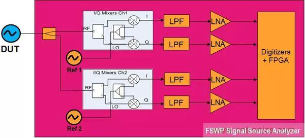 針對以上測試方法的不足,目前最新的相位噪聲測試的方法為數(shù)字相位解調(diào)法。該測試方法可以直接進行I/Q解調(diào)測量, 轉(zhuǎn)換為Sf(f), 再計算L(f)。數(shù)字相位解調(diào)法無鑒相器和鎖相環(huán),所以不需要進行環(huán)路帶寬修正,可以簡化校準過程。該測試方法可以測量CW相位噪聲,脈沖相位噪聲,附加相位噪聲,脈沖附加相位噪聲等多項指標。同時該測試方法具有極低的參考源相位噪聲、高速互相關,可以明顯提高測試的靈敏度。并且可以在大信號存在時測量小電平信號的相位噪聲。