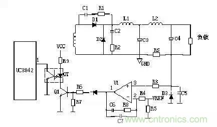當(dāng)輸出U0升高,經(jīng)取樣電阻R7、R8、R10、VR1分壓后,U1③腳電壓升高,當(dāng)其超過(guò)U1②腳基準(zhǔn)電壓后U1①腳輸出高電平,使Q1導(dǎo)通,光耦OT1發(fā)光二極管發(fā)光,光電三極管導(dǎo)通,UC3842①腳電位相應(yīng)變低,從而改變U1⑥腳輸出占空比減小,U0降低。當(dāng)輸出U0降低時(shí),U1③腳電壓降低,當(dāng)其低過(guò)U1②腳基準(zhǔn)電壓后U1①腳輸出低電平,Q1不導(dǎo)通,光耦OT1發(fā)光二極管不發(fā)光,光電三極管不導(dǎo)通,UC3842①腳電位升高,從而改變U1⑥腳輸出占空比增大,U0降低。周而復(fù)始,從而使輸出電壓保持穩(wěn)定。調(diào)節(jié)VR1可改變輸出電壓值。