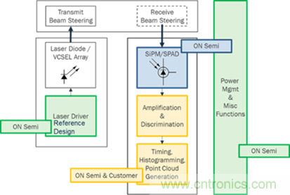 1個LiDAR系統(tǒng)有6個主要的硬件功能塊:傳輸、接收、光束轉(zhuǎn)向、光學(xué)器件、輸出和電源管理。典型的LiDAR系統(tǒng)框圖如圖1所示。其中,安森美半導(dǎo)體可提供SiPM/SPAD、激光驅(qū)動器參考設(shè)計、電源管理、放大與處理以及時序、直方圖、點云生成乃至系統(tǒng)等。成熟的模擬SiPM 產(chǎn)品有C系列、J系列、R系列。系統(tǒng)有SiPM 陣列掃描LiDAR 演示儀(超過100 m掃描距離)、把SiPM 與圖像傳感器融合的FUSEONE、最新的400 x 100 SPAD 陣列Pandion。