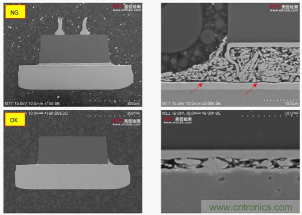 C-SAM測(cè)試結(jié)果顯示NG樣品固晶層分層明顯;SEM確認(rèn)了這一現(xiàn)象:1)失效批次樣品的Q2固晶層出現(xiàn)明顯的分層不良;2)失效批次樣品的固晶層明顯比正常批次樣品厚。