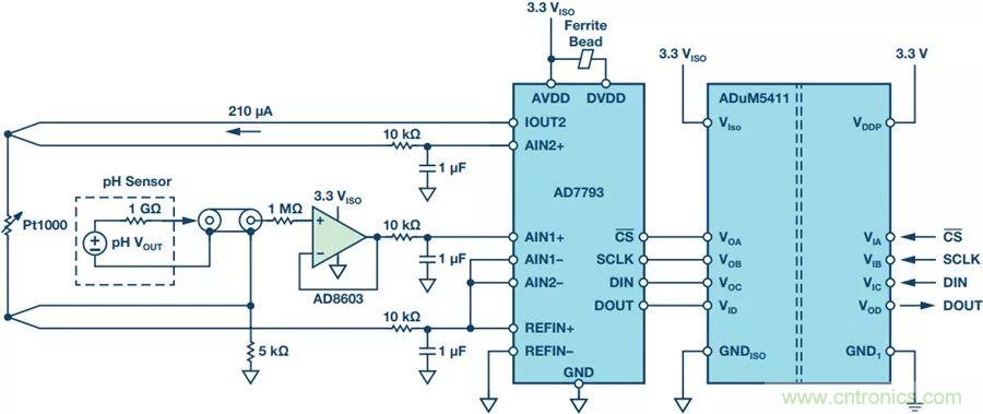 電路的三個(gè)主要元件是探針的緩沖器、ADC和具有電壓傳輸功能的隔離器。選擇緩沖運(yùn)算放大器 AD8603 的原因是它具有低功耗、低噪聲和極低輸入偏置電流。200fA典型低輸入偏置電流可確保由于電流流過探頭的內(nèi)部電阻而產(chǎn)生的壓降被最小化。另一個(gè)重要元件是ADC,此處用 AD7793表示,是具有集成電源和可編程放大器的24位∑-?轉(zhuǎn)換器。集成電流源產(chǎn)生流經(jīng)Pt1000的電流。借此進(jìn)行在處理器中進(jìn)行補(bǔ)償所需的溫度測量。此電流還流經(jīng)5kΩ電阻(0.1%容差),由此產(chǎn)生1.05V基準(zhǔn)電壓。作為第二個(gè)功能,電阻提升了共模電壓。通過這種方式及通過選擇基準(zhǔn)電壓,ADC的輸入范圍得到充分利用:探針輸出±414 mV——最大±490 mV。隔離器為 ADuM5411, 即同 時(shí)提供ADC的SPI接口隔離的隔離式DC-DC轉(zhuǎn)換器。