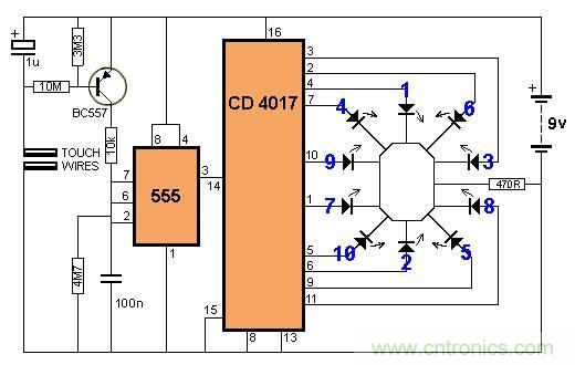 當(dāng)手指碰到感應(yīng)線的時(shí)候,電路讓LED依次點(diǎn)亮,產(chǎn)生旋轉(zhuǎn)的效果。手指移開,旋轉(zhuǎn)降速,最終停止。