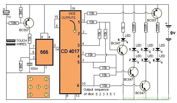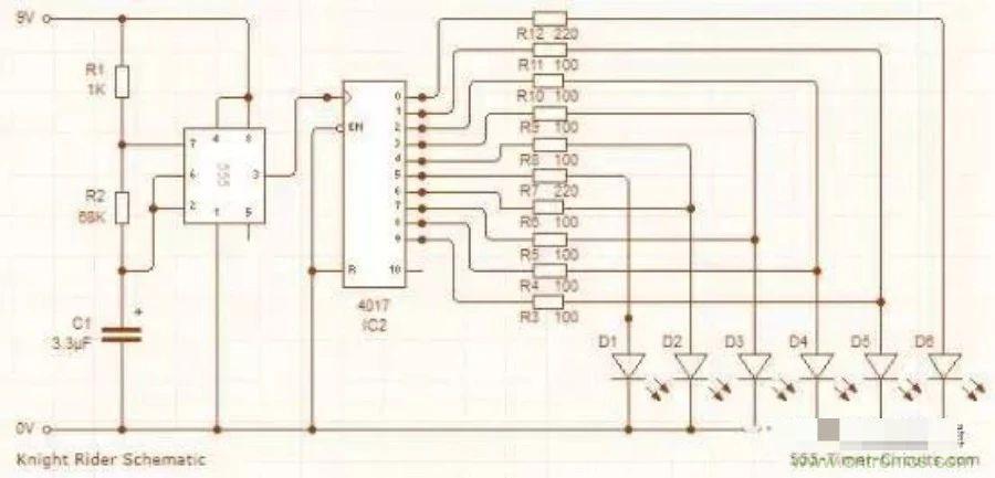 這個(gè)電路讓左邊的LED閃3次,然后是右邊閃三次,接著重復(fù)。在這個(gè)電路中,555會(huì)通過管腳3產(chǎn)生連續(xù)的方波。