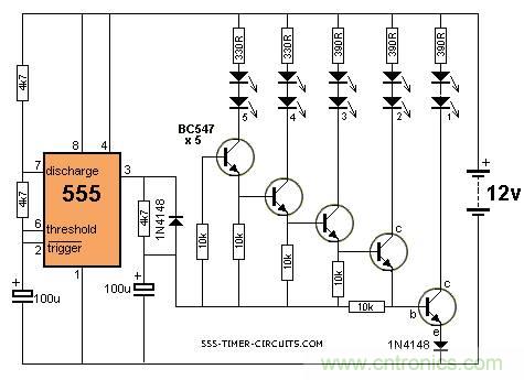 555工作在2Hz,當(dāng)電壓是一個(gè)方向時(shí),一個(gè)LED點(diǎn)亮;三極管開路,所有的LED都將閃爍,三極管短路,所有LED都不亮。