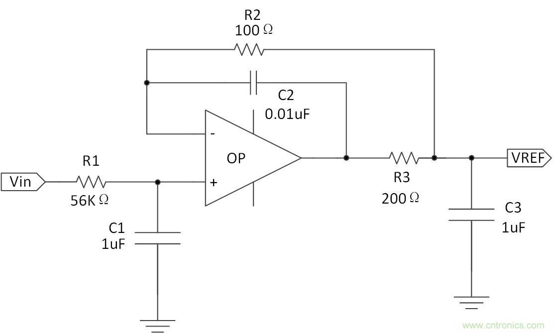 如上圖系統(tǒng)方案所示,針對(duì)50Hz工頻干擾,在“基準(zhǔn)緩沖電路”中,采用硬件濾波電路,降低50Hz工頻對(duì)ADC芯片基準(zhǔn)電壓的影響。如圖3,本質(zhì)上是一個(gè)電壓跟隨緩沖電路結(jié)合低通濾波器,R1C1針對(duì)50Hz濾波,R2R3C2C3針對(duì)50Hz高次諧波的過(guò)濾。