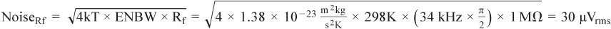 知道ENBW后,就可以求出反饋電阻造成的均方根噪聲和運(yùn)算放大器的電流噪聲。電阻的約翰遜噪聲直接出現(xiàn)在輸出端,運(yùn)算放大器的電流噪聲經(jīng)過(guò)反饋電阻后表現(xiàn)為輸出電壓。