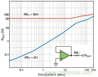 當所選基準電壓源的驅(qū)動能力不夠時,或者首選微功耗基準電壓源時,可使用基準電壓緩沖器。可通過將適當?shù)倪\算放大器配置為單位增益而實現(xiàn)。運算放大器必須具有低噪聲和適當?shù)妮敵鲵?qū)動能力,并且要能夠穩(wěn)定工作在較大容性負載下。它還必須要能提供所需電流。通常不指定運算放大器的輸出阻抗,但一般可通過輸出阻抗與頻率的關(guān)系圖確定,如圖5中的AD803180 MHz軌到軌運算放大器所示。