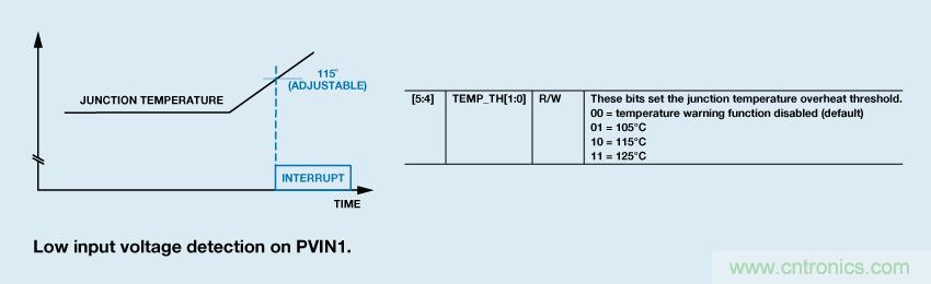 結(jié)溫監(jiān)控:可以監(jiān)控結(jié)溫以判斷是否發(fā)生過(guò)溫等故障。如果結(jié)溫高于預(yù)設(shè)值(105°C、115°C或125°C),nINT上就會(huì)產(chǎn)生報(bào)警信號(hào)。與熱關(guān)斷不同的是,此功能發(fā)送警告信號(hào)而不關(guān)斷器件。具備監(jiān)控結(jié)溫并提醒系統(tǒng)處理器注意避免發(fā)生系統(tǒng)故障的能力可提高系統(tǒng)可靠性,如圖9所示。