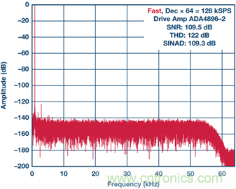 圖1. 數(shù)字化50 kHz輸入帶寬??焖倌J叫阅?,F(xiàn)FT表示采用ADA4896-2驅(qū)動(dòng)的性能。(AD7768為快速模式,dec × 64得到輸出速率為128 kSPS)預(yù)充電模擬輸入緩沖器開啟。