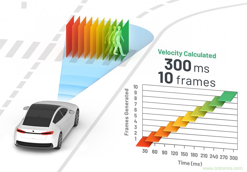 車輛成像系統(tǒng)的一個(gè)重點(diǎn)是能夠快速計(jì)算橫向速度,即物體正交(以直角)移動(dòng)到車輛行駛方向的速度。但是,要實(shí)現(xiàn)足夠低的誤報(bào)率,即使是主要基于攝像頭的出色機(jī)器學(xué)習(xí)算法仍然需要大約300 ms來進(jìn)行橫向移動(dòng)檢測。對于在以每小時(shí)60英里速度行駛的車輛前方行走的行人來說,毫秒之差就關(guān)系到人員受傷的輕重程度,因此響應(yīng)時(shí)間至關(guān)重要。