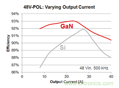 圖2顯示了GaN和硅FET之間48V至POL的效率比較。