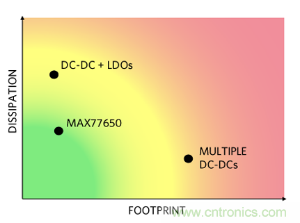 Maxim 的 SIMO 轉(zhuǎn)換器通常達(dá)到了占位面積和散熱之間的最佳平衡,其結(jié)構(gòu)既擁有 DC-DC 轉(zhuǎn)換器的優(yōu)勢,又具有單個 DC-DC 轉(zhuǎn)換器+多個集成 LDO 架構(gòu)的外形尺寸。此外,通過減少電感,也消除了電感之間的空隙,進(jìn)一步降低總外形尺寸。