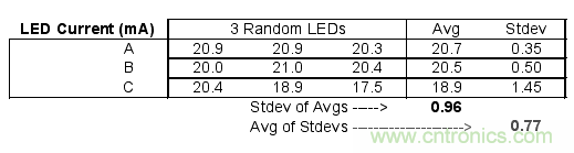 表 1. 為了評估圖 1 電路的生產(chǎn)能力,我們對三種不同廠商提供的白光 LED 進行了測試。從測試結果看,不同商標的 LED 一致性較差,比標準平均電流偏差 3.27mA。