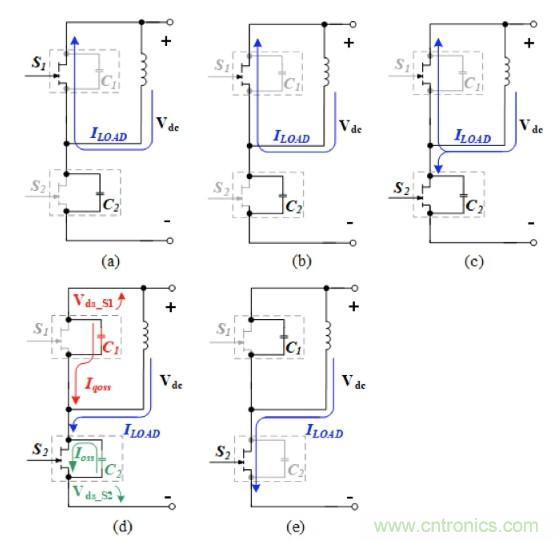 圖3這些硬開關(guān)轉(zhuǎn)換圖顯示了S1導(dǎo)電(a)、死區(qū)時間(b)、電流換向(c)、電壓換向(d)和S2導(dǎo)電(e)。