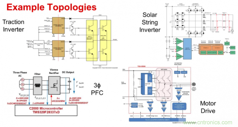使用隔離式柵極驅(qū)動器的常用拓撲包括牽引逆變器、電機驅(qū)動器、三相功率因數(shù)校正電路和串式光伏逆變器。這些拓撲都在交流和直流電源之間轉(zhuǎn)換,直接與高電壓直流總線和電機或電網(wǎng)等三相系統(tǒng)相連。
