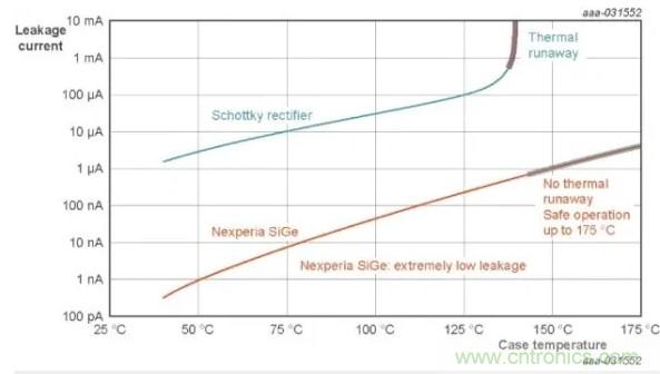 圖3:Schottky和SiGe整流器的泄漏電流與外殼溫度的關(guān)系。當(dāng)漏電流增加到超指數(shù)時,就會發(fā)生熱失控。