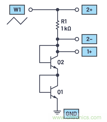 面包板連接如圖7所示。AWG發(fā)生器的輸出驅(qū)動電阻R1的一端和示波器通道2的2+輸入。Q1的發(fā)射極接地。Q1的基極和集電極都連接至Q2的發(fā)射極。Q2的基極和集電極連接至R1的另一端和示波器通道2的2–輸入,以及示波器通道1的1+輸入。