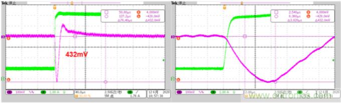 【導(dǎo)讀】在DCDC電源測試中,負載瞬態(tài)測試(Load Transient Test)是十分重要的一環(huán),利用負載瞬態(tài)測試,可以快速評估所測電源的穩(wěn)定性與快速性,而在DCDC轉(zhuǎn)換器芯片的選型時,負載瞬態(tài)測試表現(xiàn)也是評估該芯片動態(tài)性能的重要參考。下圖是某DCDC轉(zhuǎn)換器負載瞬態(tài)測試的典型波形,CH3為輸出電壓的AC分量,CH4為負載電流。注意到負載電流上升斜率與下降斜率并不相同,較緩的上升斜率對應(yīng)較小的電壓跌落(Undershoot),而陡峭的下降斜率則對應(yīng)較大的電壓過沖(Overshoot)。