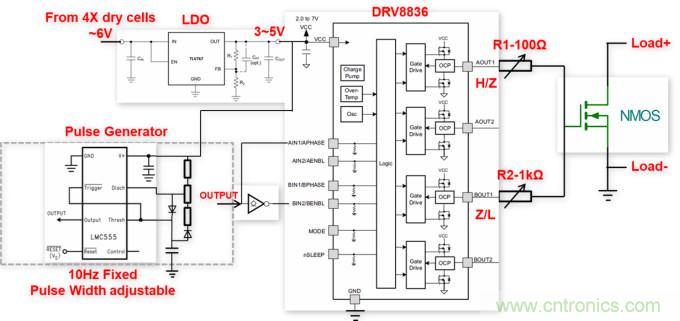 針對上述傳統(tǒng)方法的不足,本文設(shè)計了一種基于MOSFET的小功率實用電子負載。如下圖所示,該設(shè)計主要包括MOSFET,驅(qū)動級,電源軌及脈沖發(fā)生器四部分。其基本工作原理為:MOSFET并非處于常規(guī)的開關(guān)狀態(tài),而是使其工作在恒流區(qū),脈沖發(fā)生器通過DRV8836驅(qū)動MOSFET,產(chǎn)生一定幅值和脈寬的GS電壓,進而實現(xiàn)漏極電流(負載電流)的跳變。其中負載電流的幅值可通過調(diào)節(jié)LDO輸出電壓進行控制,負載電流的上升/下降斜率則可通過調(diào)節(jié)驅(qū)動電阻阻值進行控制。