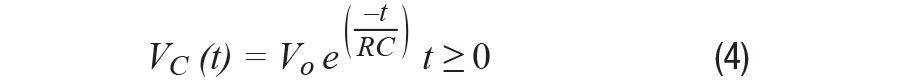其中Vo表示t = 0時(shí)電容中存儲(chǔ)的初始電壓,RC = τ,是時(shí)間常數(shù)。 該響應(yīng)曲線是一個(gè)衰減式指數(shù),如圖4所示。