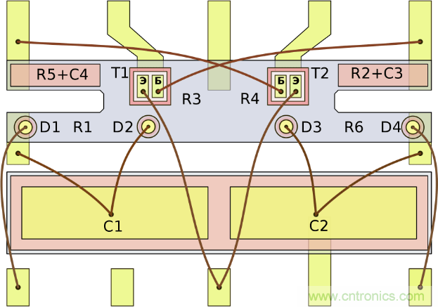 下圖為它的原理圖,可以看出,這個芯片的構造非常簡單,包含兩個晶體管、四個二極管、六個電阻和兩個電容。