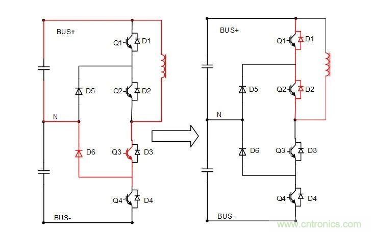 如圖七所示,當(dāng)I型三電平工作在第一象限時(shí),測(cè)試對(duì)象為I型三電平拓?fù)渲蠶1和D5,測(cè)試時(shí)給Q1發(fā)雙脈沖驅(qū)動(dòng),Q2處于常通狀態(tài),Q3和Q4處于關(guān)斷狀態(tài),電感連接在母線的N端和橋臂輸出端,圖中標(biāo)紅的器件顯示了Q1導(dǎo)通和關(guān)斷時(shí)的電流通路。