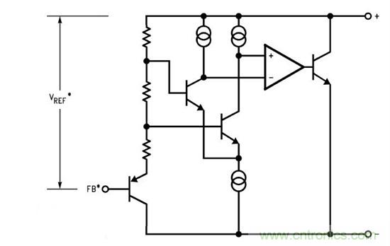 LM4041-N將VO到FB引腳上的電壓保持在1.24V,如圖4所示。電阻分壓器設置輸出直流電壓。RS提供LM4041-N和負載的電流。